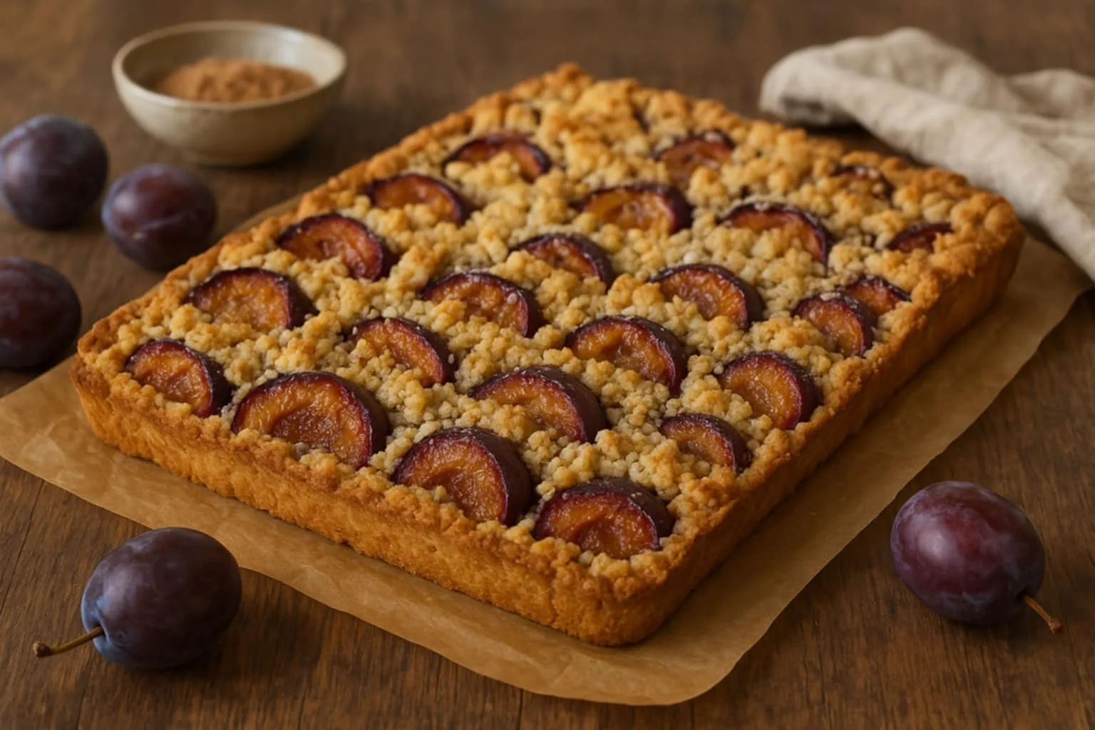 Składniki: 300 g mąki pszennej, 200 g zimnego masła, 100 g cukru pudru, 1 żółtko + 1 całe jajko, 1 łyżeczka proszku do pieczenia, szczypta soli, 700–800 g śliwek węgierek, 2 łyżki cukru (do owoców), 1 łyżeczka cynamonu.