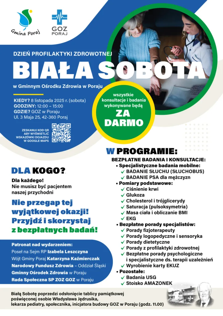 Gminny Ośrodek Zdrowia w Poraju wraz z Urzędem Gminy Poraj zapraszają mieszkańców oraz wszystkich zainteresowanych na wyjątkową Białą Sobotę – Dzień Profilaktyki Zdrowotnej, która odbędzie się 8 listopada 2025 roku w godzinach 12:00–15:00 w siedzibie ośrodka przy ul. 3 Maja 25.